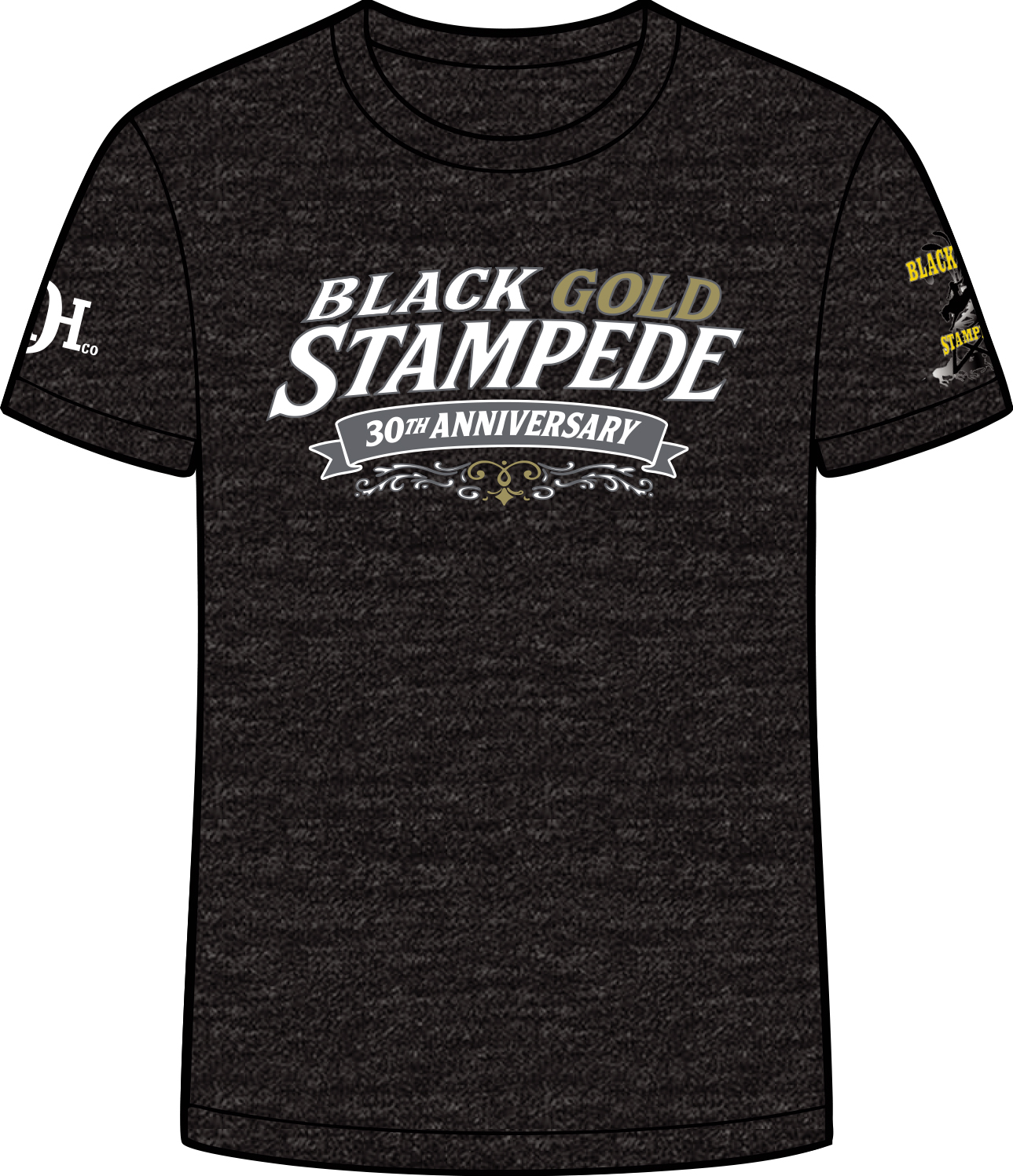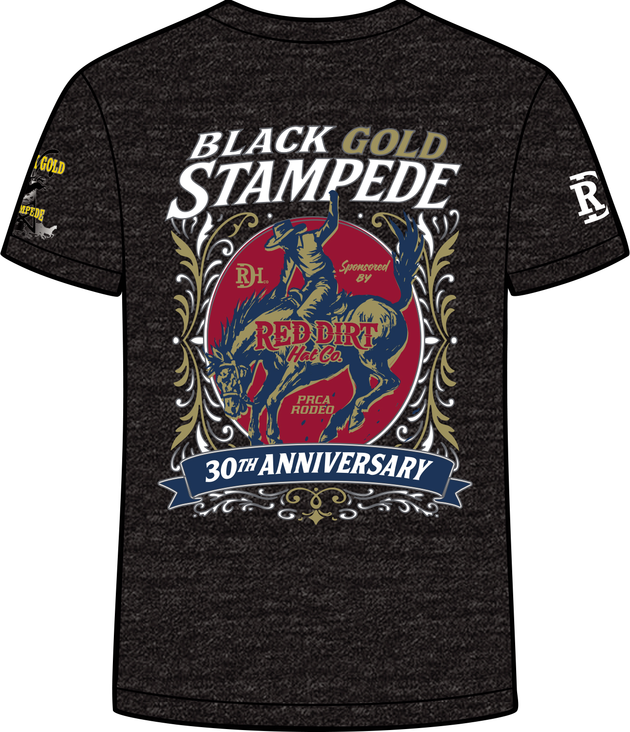 Unisex black heather blend t-shirt featuring the exclusive “2025 Black Gold Stampede Rodeo” design on the back and the 30th Anniversary Logo on the front, as well as the signature RDH brand on the right sleeve and Black Gold Stampede logo on the left sleeve.