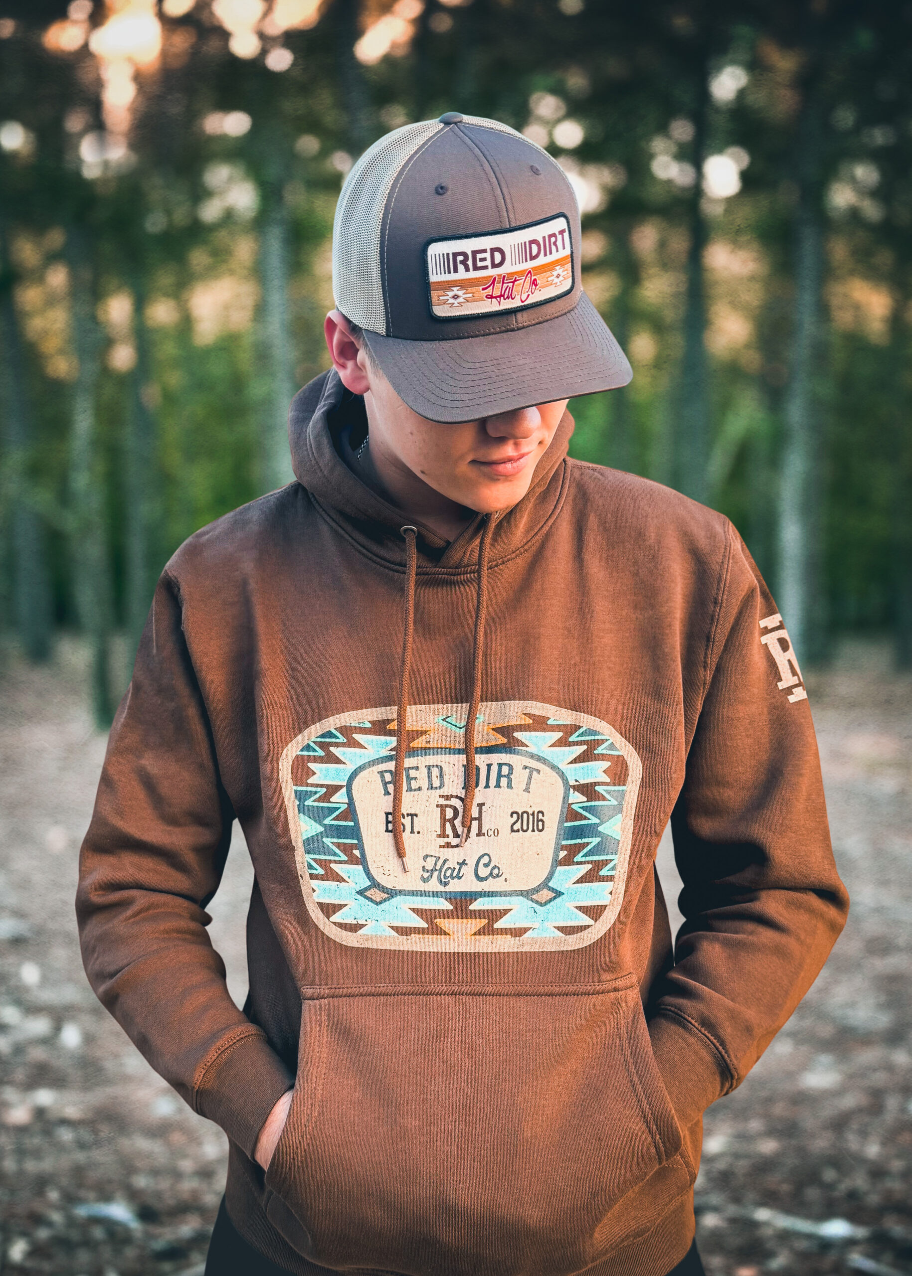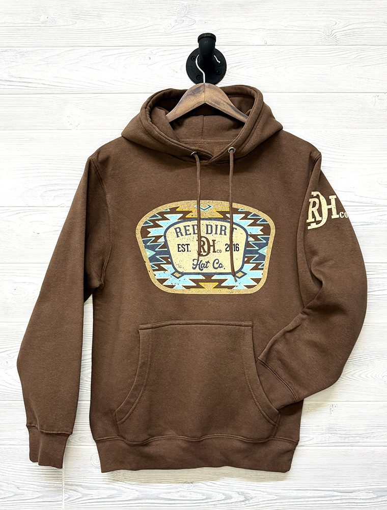 Unisex Heather Brown hoodie featuring the exclusive “Aztec Jango” design on the front, as well as the signature RDH brand on the sleeve.