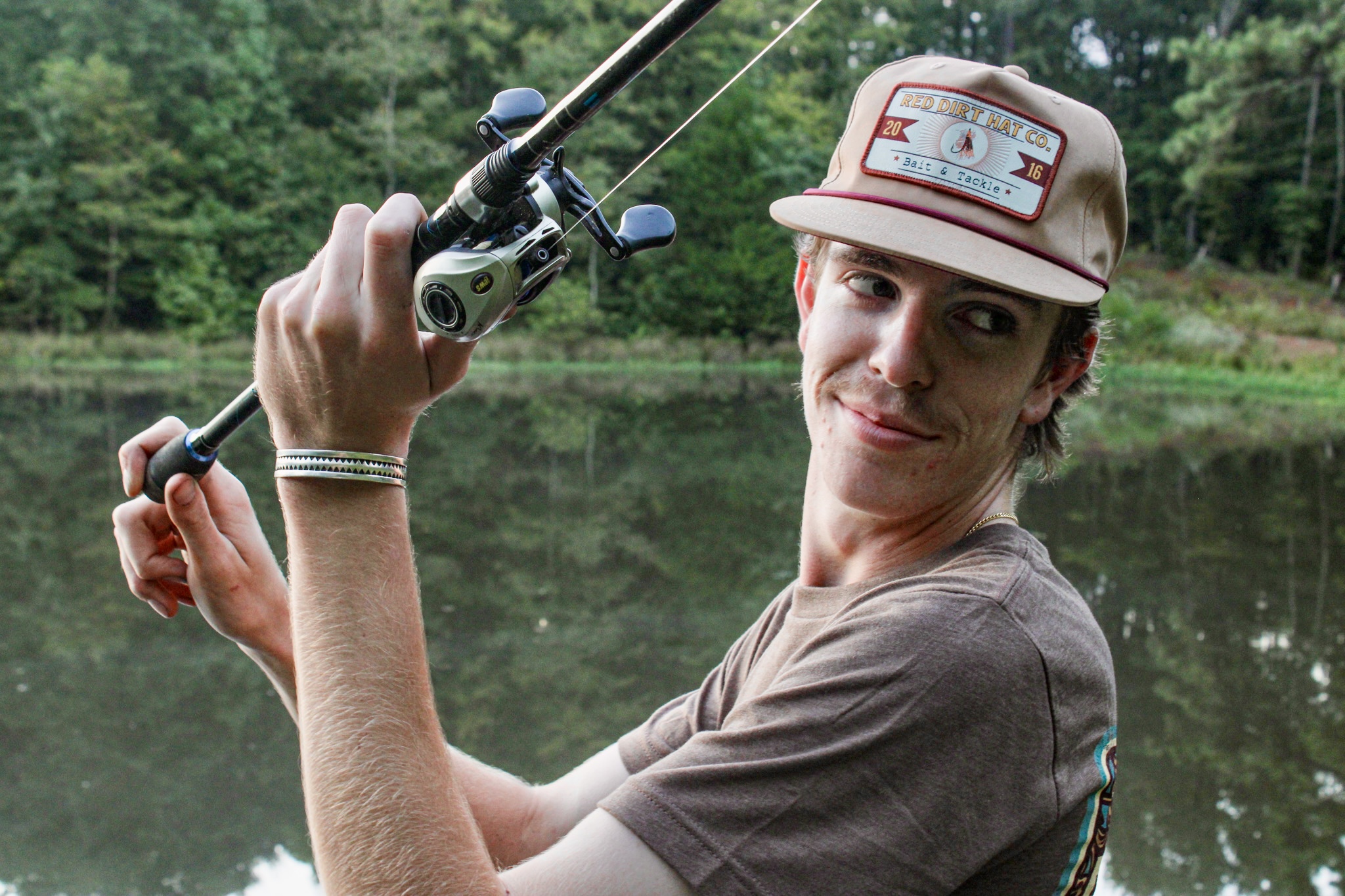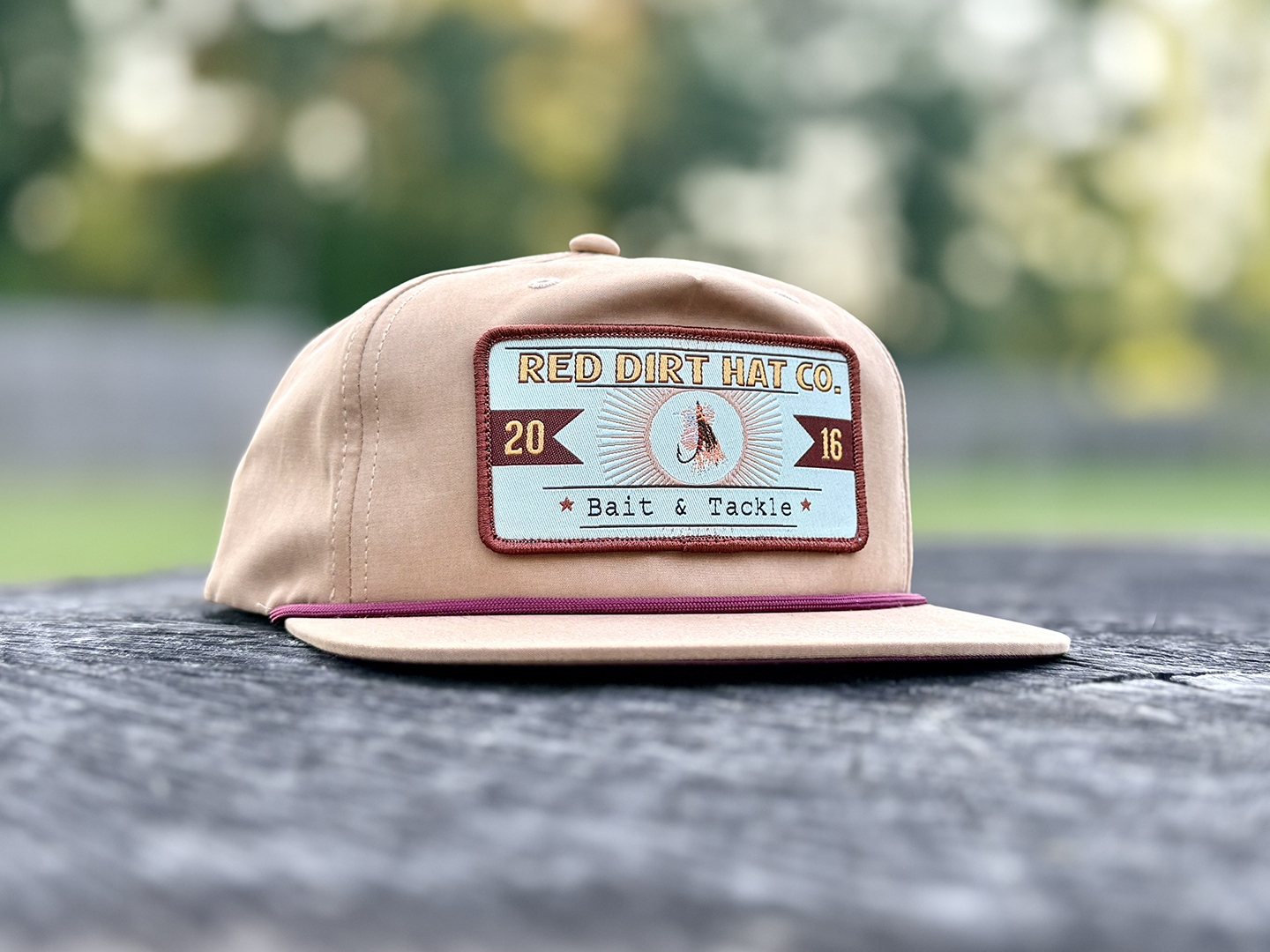 Description: Tan/Tan with maroon rope unstructured 5 panel flat bill style snapback cap featuring the “Catch & Release” patch.