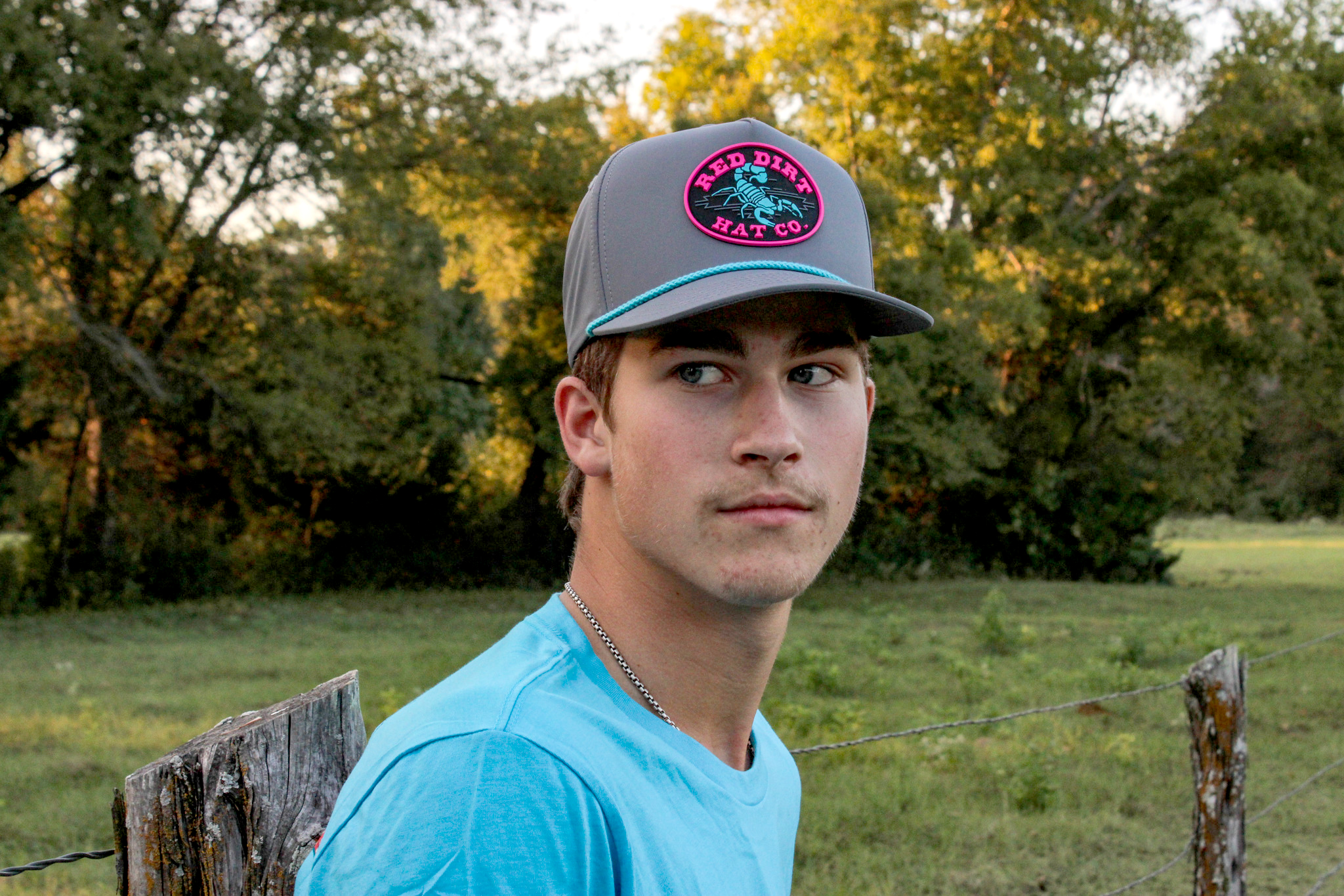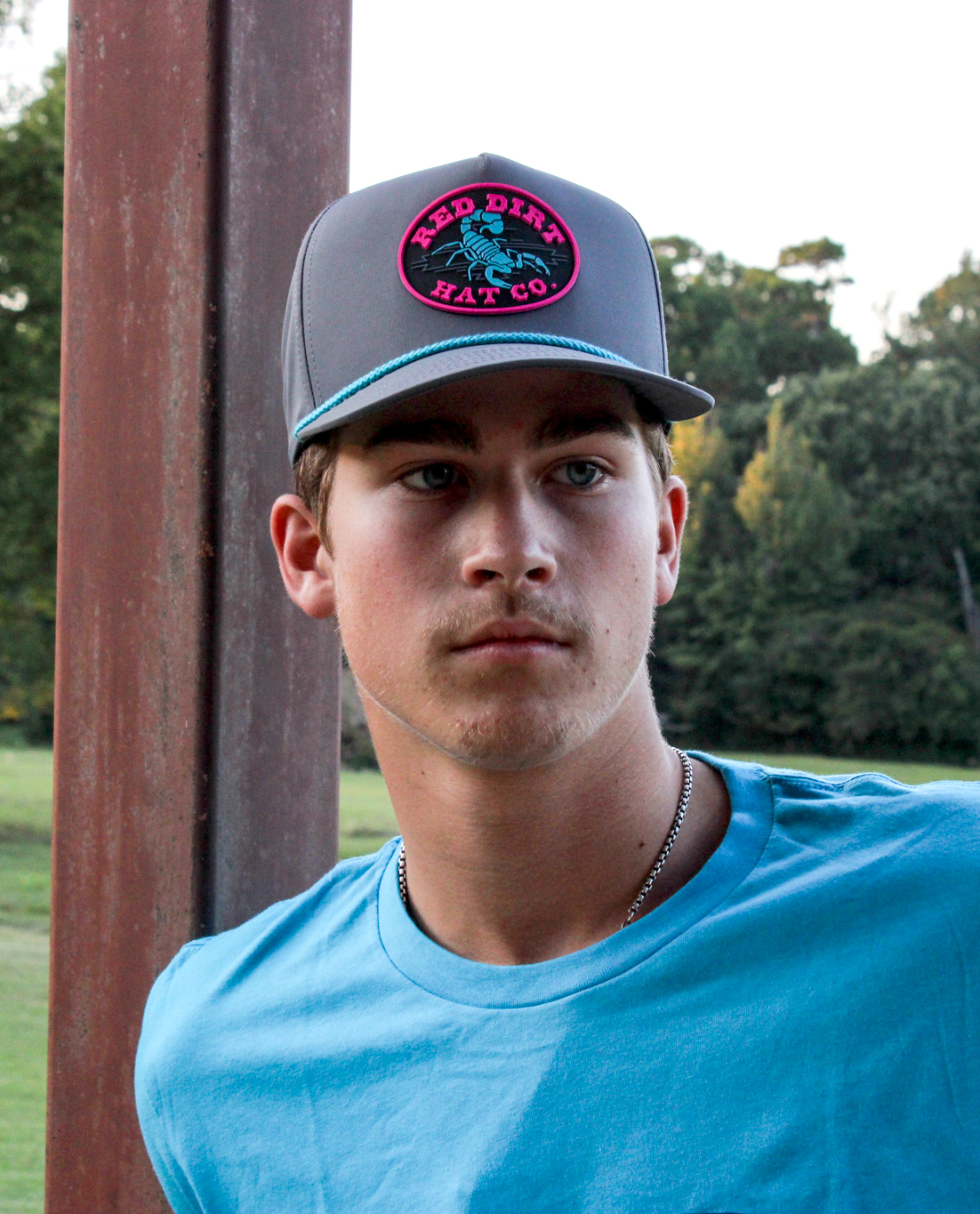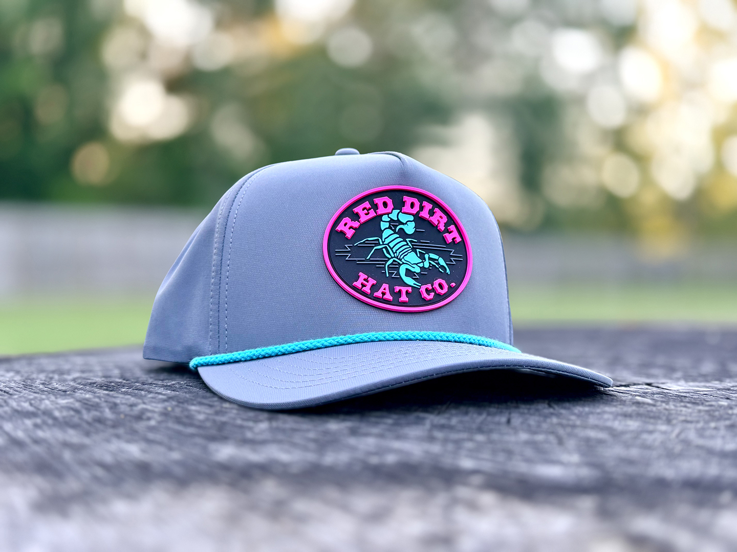 Description: Olive Grey with turquoise rope classic 5 panel curve bill style snapback cap featuring the “Durango” patch.