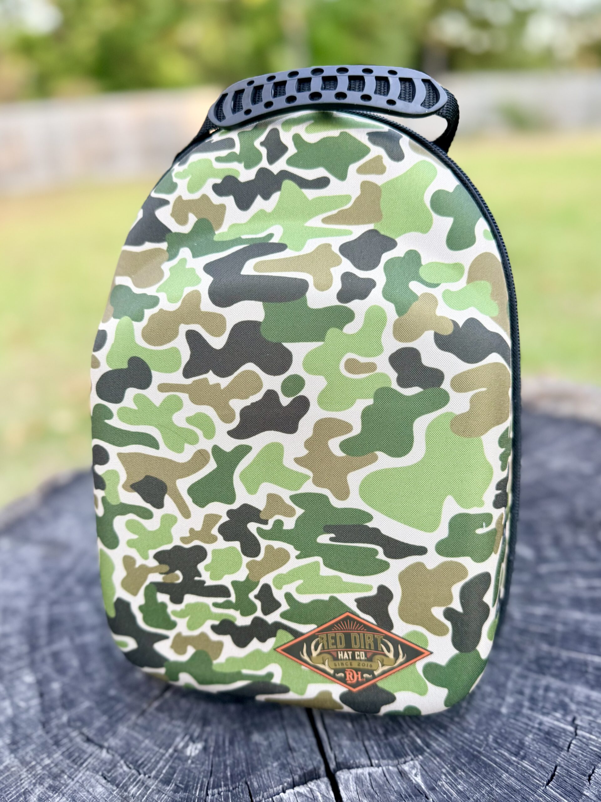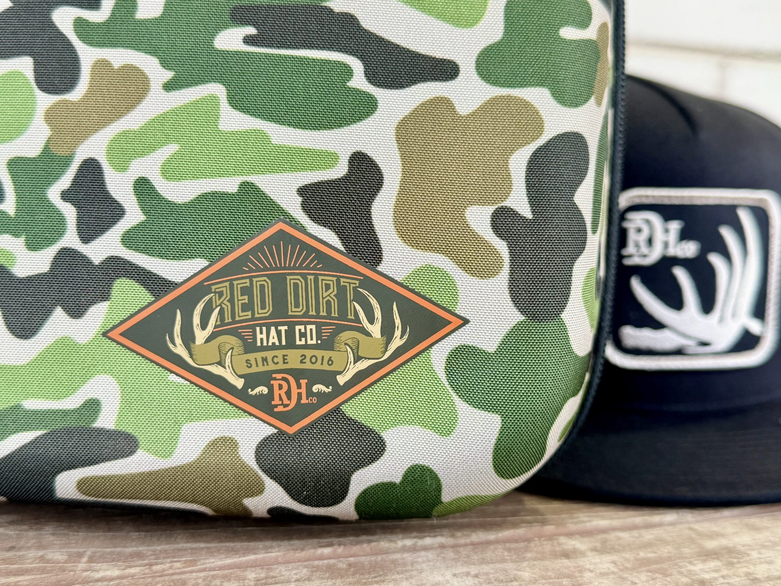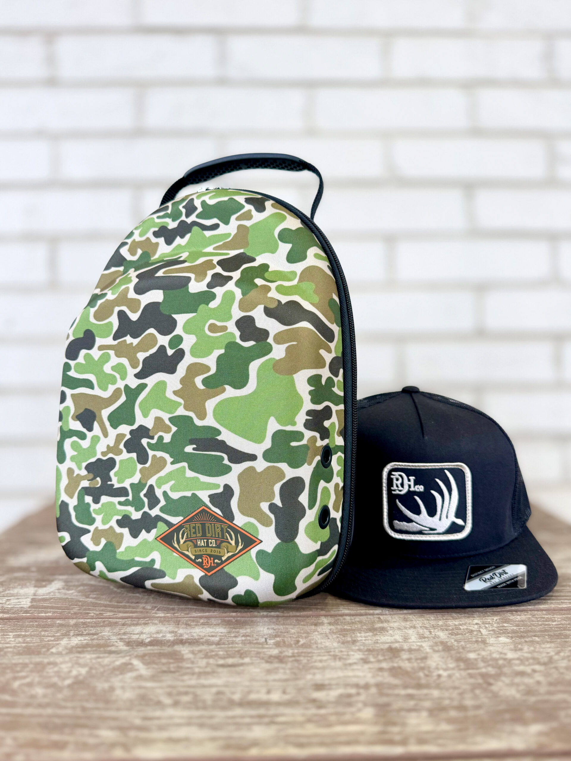 Description: Protect your favorite caps in style with our hard shell cap carrier. Designed to hold up to four baseball or rodeo caps, this sleek and durable case keeps your headwear safe from damage or getting crushed during travel or storage. Featuring a bold, vibrant green camo design on the front cover with the exclusive “Antlers” emblem, it’s as eye-catching as it is functional. The secure zipper enclosure keeps everything in place, while the built-in zippered sunglass holder adds a bonus convenience. Complete with a comfortable carrying handle, this is the ultimate travel companion for hat lovers on the go.