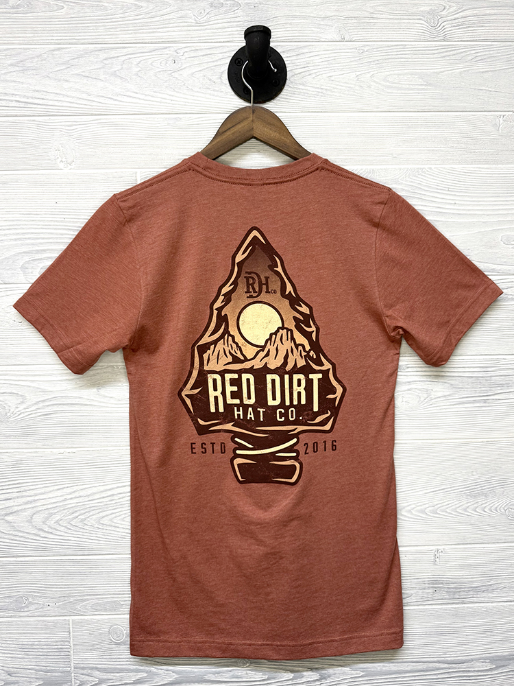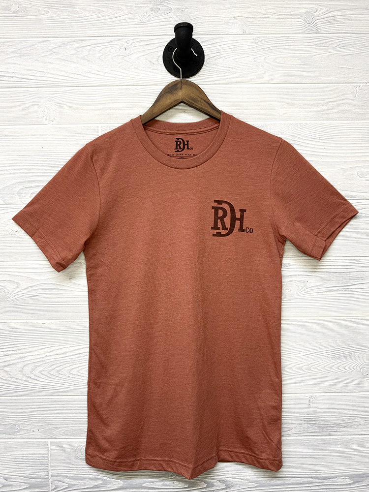 Unisex heather clay t-shirt featuring the exclusive “Sunset Peak” design on the back, as well as the signature RDH brand on the front.
