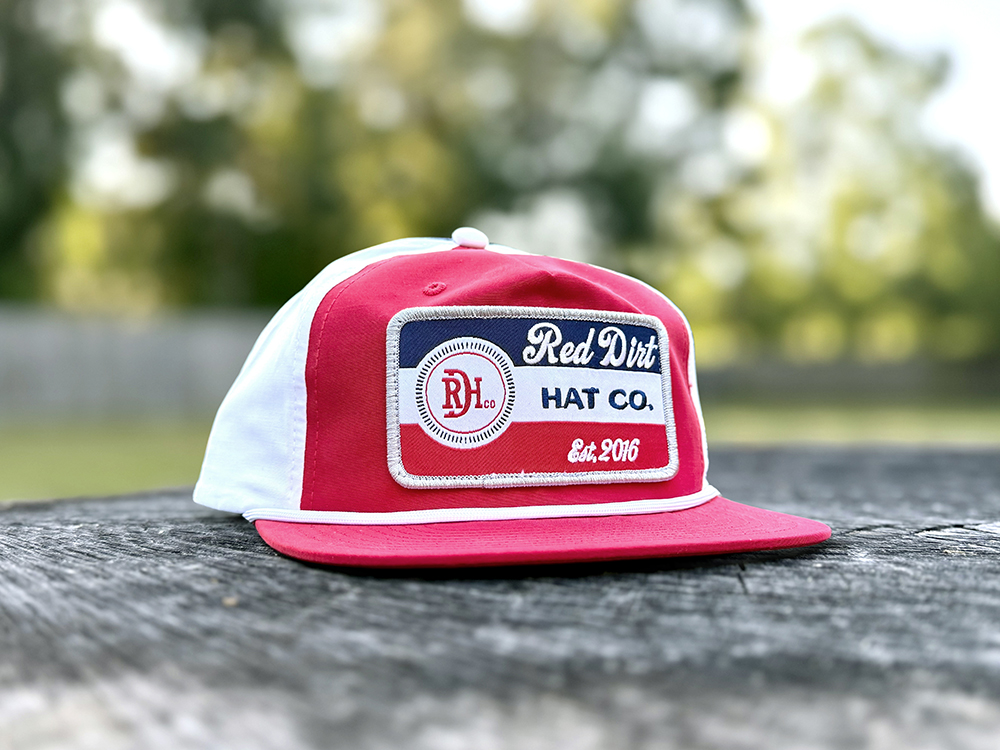 Description: Red/White/Navy with white rope classic 5 panel flat bill style snapback cap featuring “The Patriot” patch.